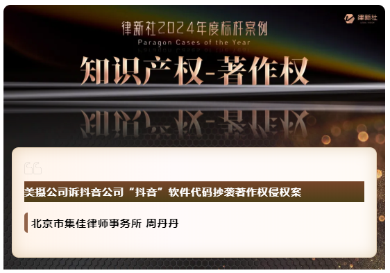 欧陆娱乐凭借在知识产权保护领域卓越的专业实力与良好的行业口碑,入选《律所卓越品牌影响力指南(2024)》,荣获“律新社2024年度精品品牌律所30佳”奖项;同时,集佳周丹丹律师代理的“美摄公司诉抖音公司'抖音'软件代码抄袭著作权侵权案”获评“律新社2024年度标杆案例:知识产权-著作权领域”。